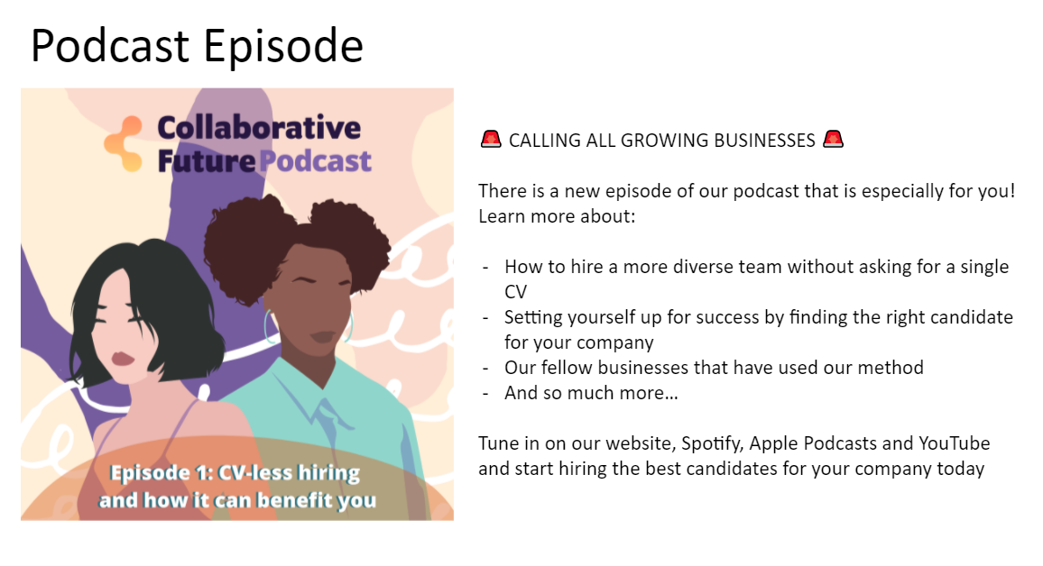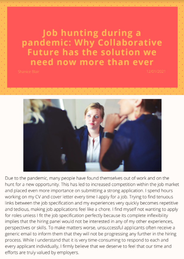 Hannah, our interviewee recorded a podcast episode titled “Have we been wrongfully hired?“ where, with two other individuals they together discuss their experiences of looking for jobs, and delve into (and take apart!) Collaborative Future’s approach to hiring in detail.