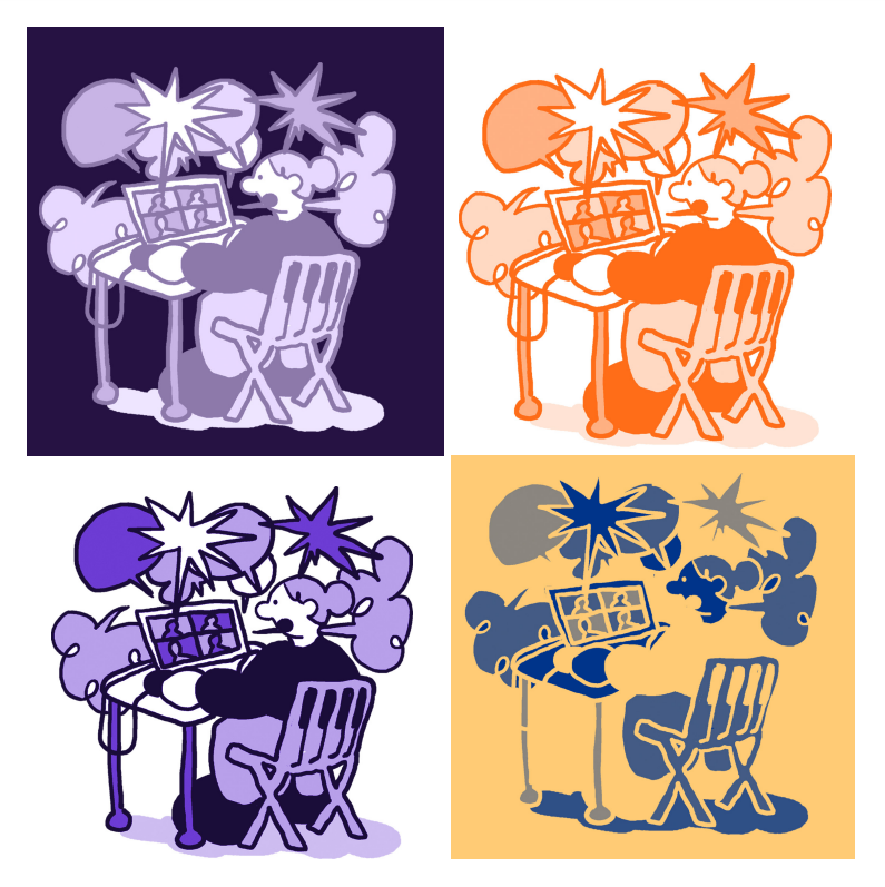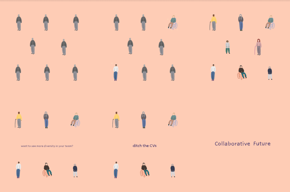 Tommy, our interviewee created a set of illustrations and social media assets following Collaborative Futures branding to illustrate the stresses of online recruitment in COVID times, and illustrating the diverse community our CV-less recruitment attracts.