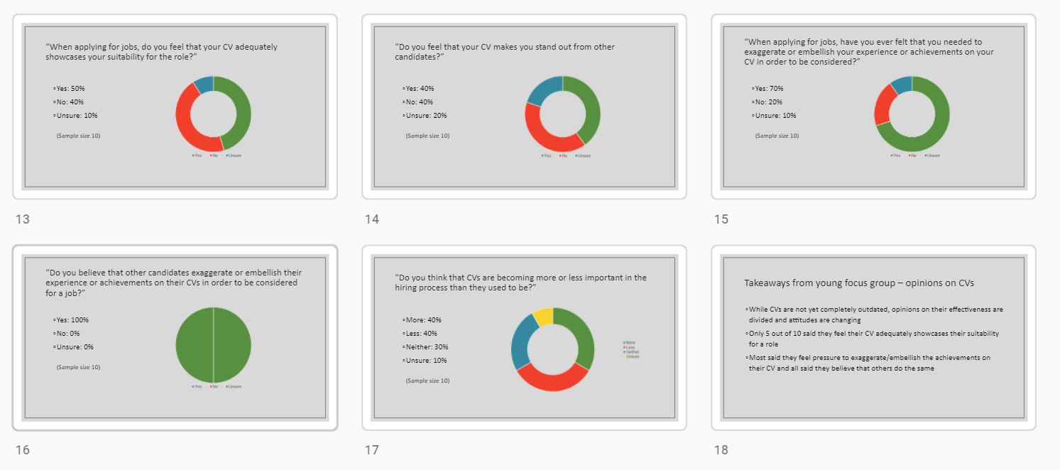 Becky, our interviewee spent her set three hours completing research by getting together a focus group of young people, and engaging with them on the topic of job hunting and using CV’s to show their skills or experience. She then neatly showcased her findings through graphs and stats.